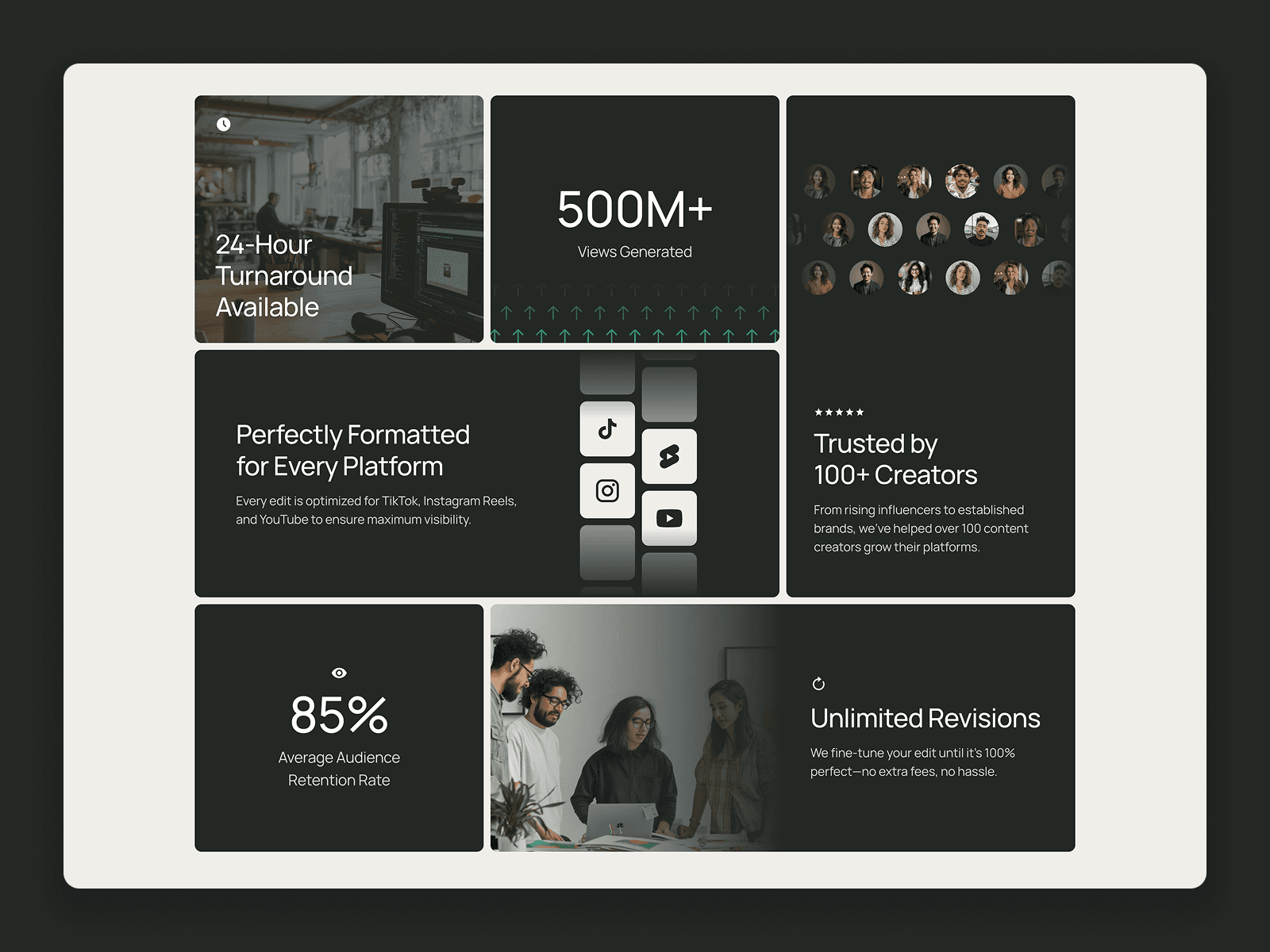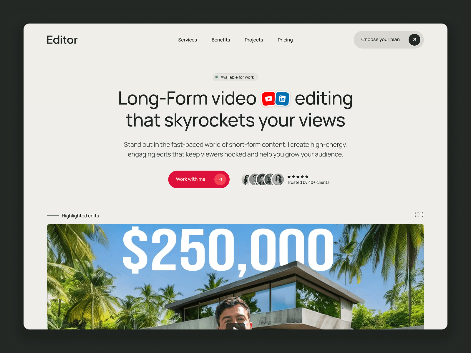 The Editor Framer template is perfect for short-form (TikTok, Instagram Reels, Shorts) and long-form (YouTube) video editors who need a bold, high-converting portfolio to showcase edits, attract creators and brands, and grow their client base with ease.