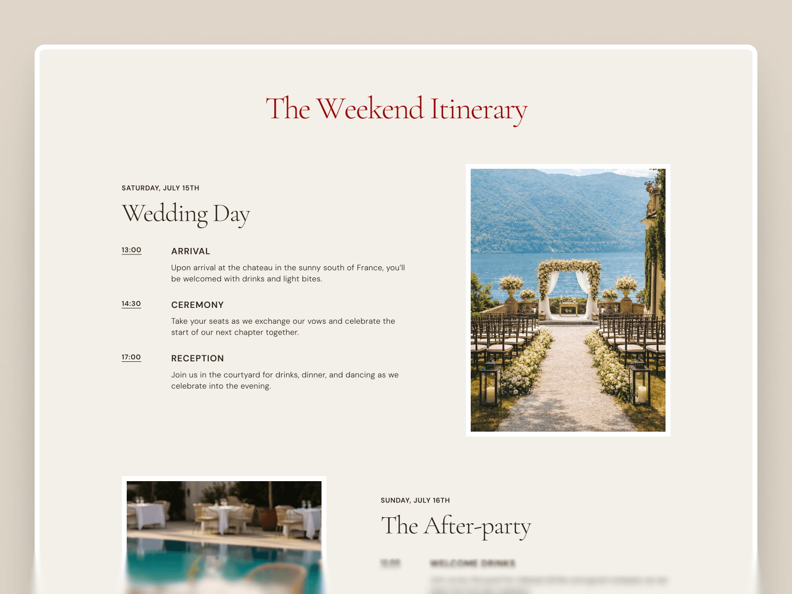 Whether you’re planning a destination wedding in the South of France, a relaxed summer celebration, or a modern city ceremony, Engaged provides a beautiful and practical foundation for your wedding website. Share your story, keep your guests informed, and manage RSVPs — all in one place with a template designed to make the process simple.