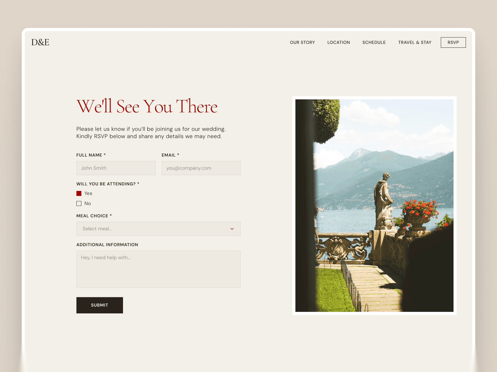 Built-in RSVP Form: Collect guest responses directly through the website with a clean, easy-to-use RSVP form.