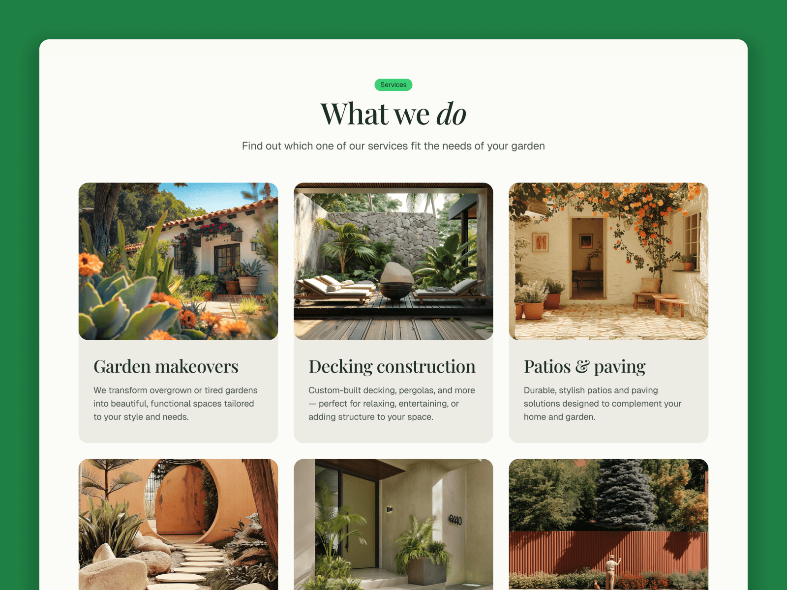The Glade Framer template is ideal for landscaping and gardening businesses looking to showcase stunning outdoor transformations, attract new clients, and grow their business with a clean, high-converting website.