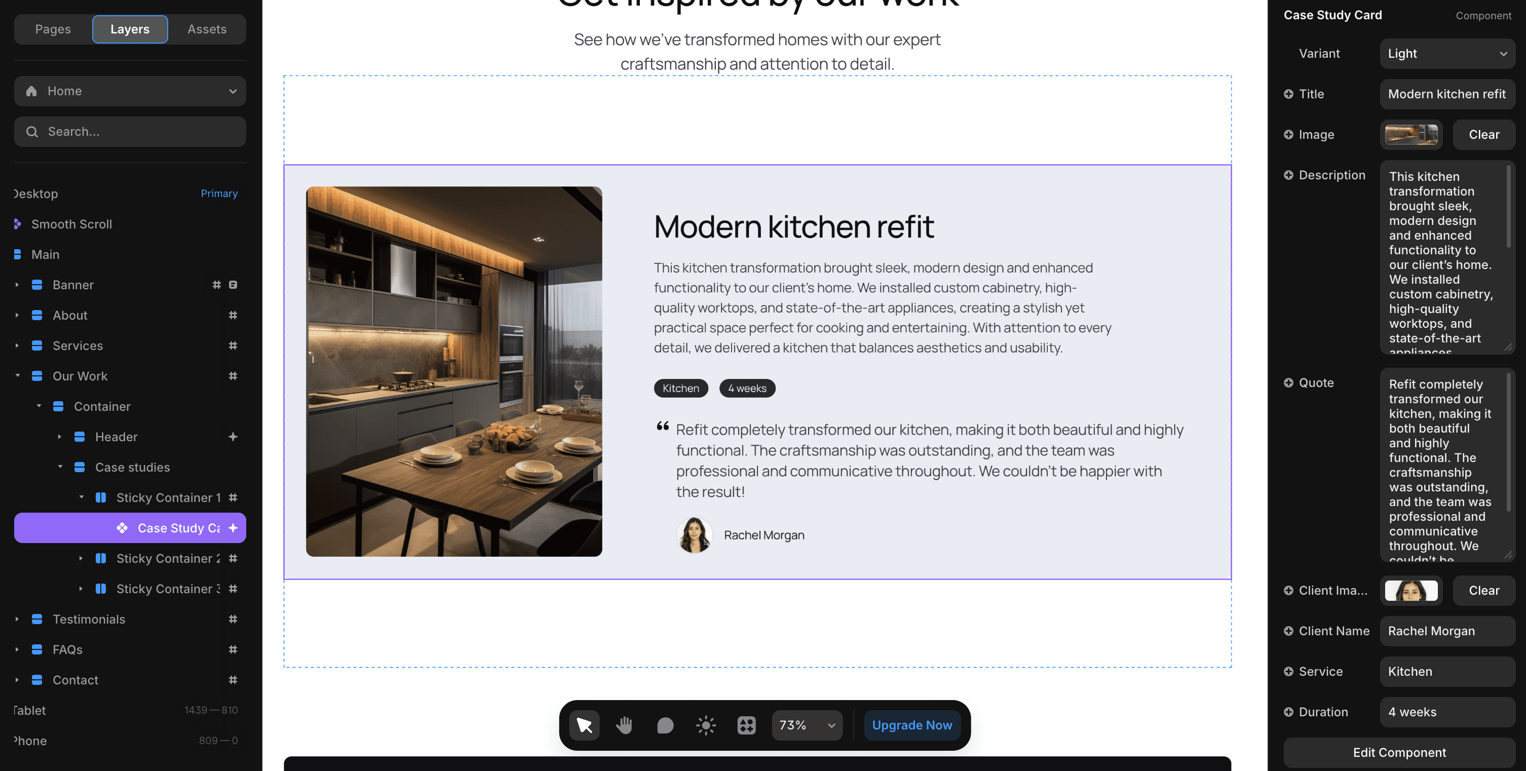 Text and images inside components (they're purple when you click them) will have clearly labeled variables in the right panel to edit them, as shown in the image below for the "Case Study Card" component from my Refit template.